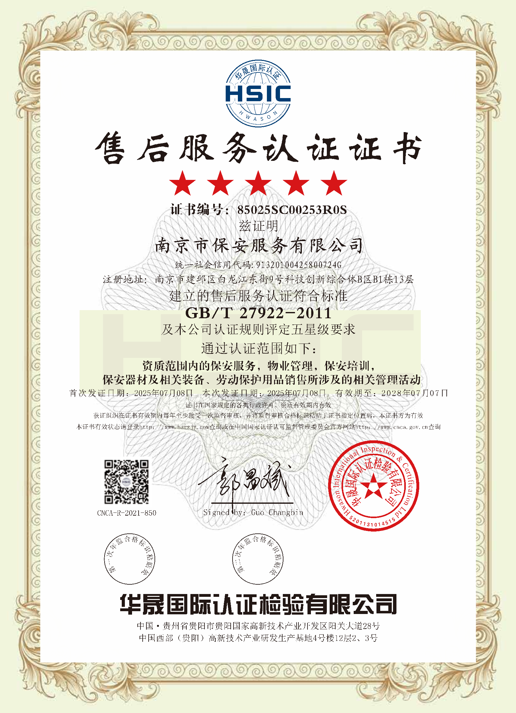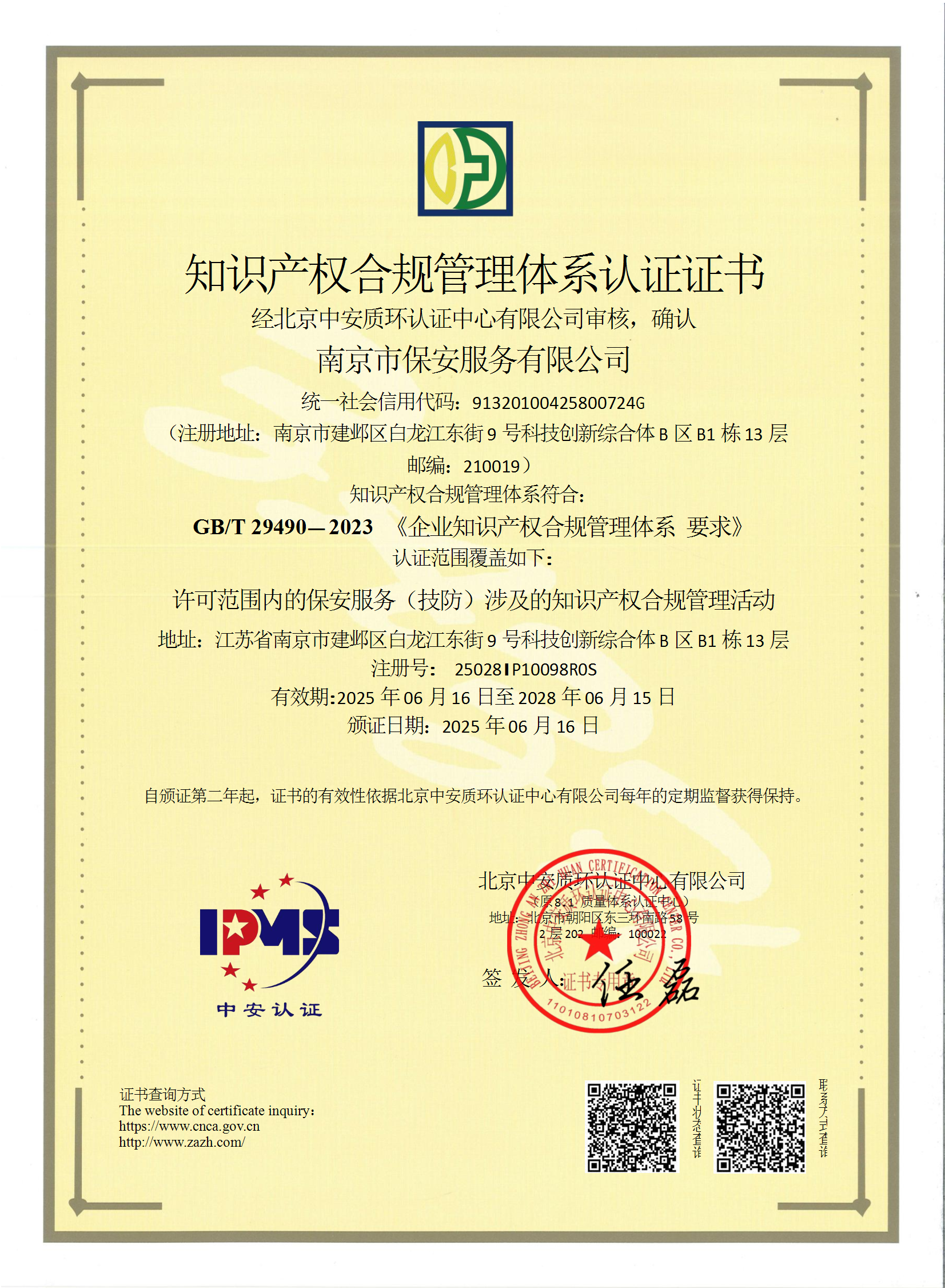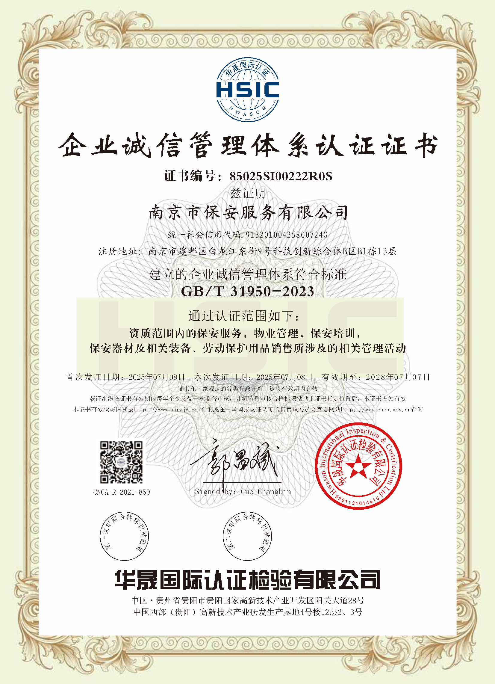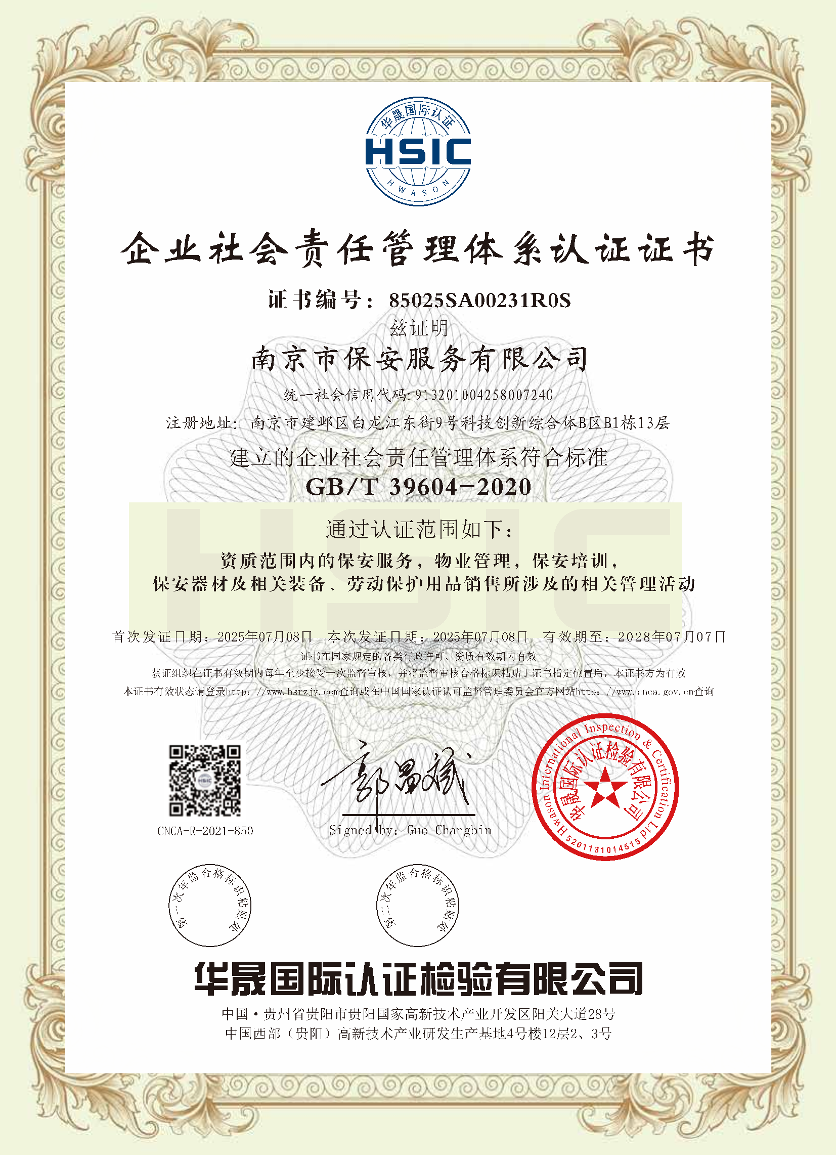 祝賀:南京市保安服務(wù)總公司通過企業(yè)誠信管理體系認證和企業(yè)社會責(zé)任管理體系認證